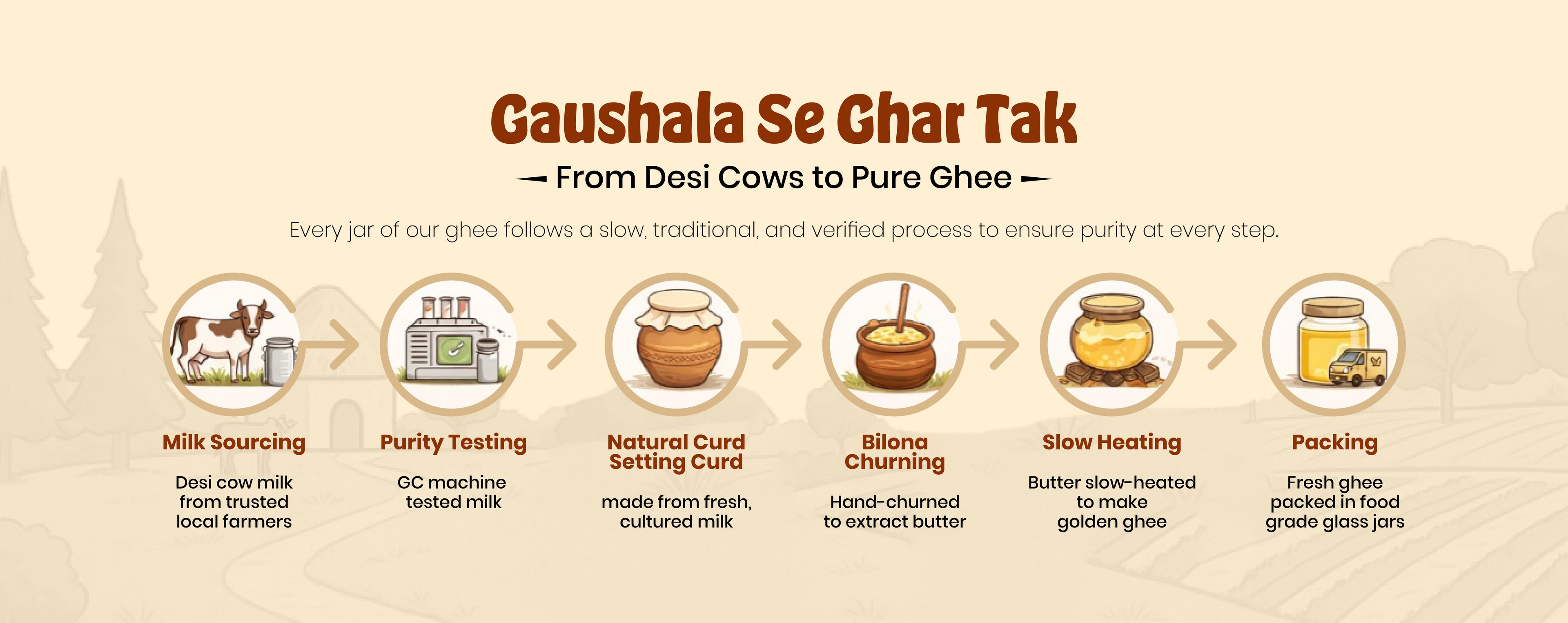 Our ghee is made from GC-tested milk, sourced directly from trusted farmers, ensuring zero adulteration and consistent quality.